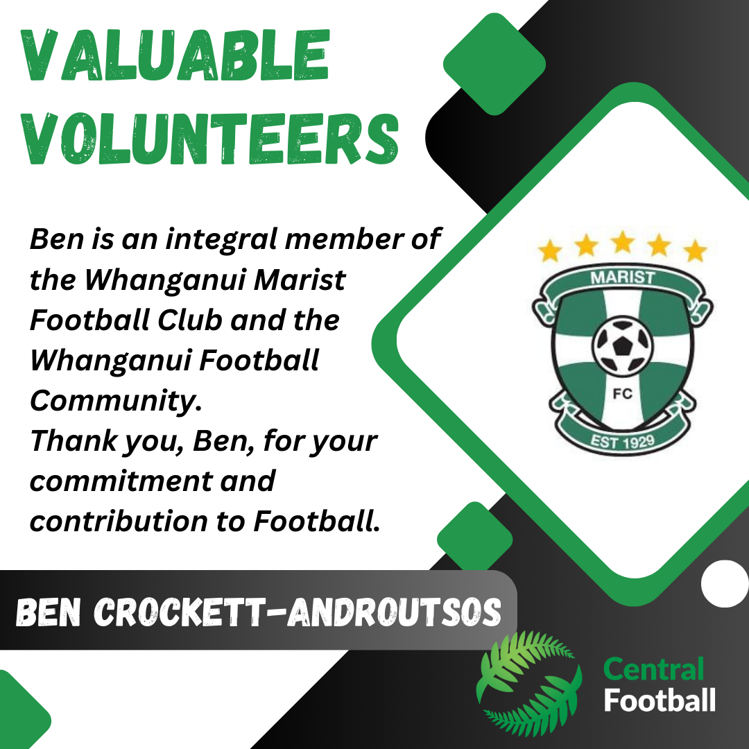 This month’s Central Football Valuable Volunteer for Whanganui is Ben Crockett-Androutsos – Whanganui Marist
